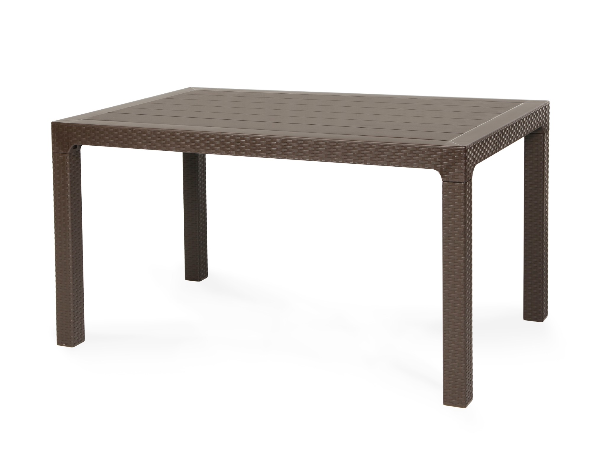 Mesa de diseño, imitación a rattán, polipropileno de color marrón chocolate, 140 x 80 cms. Otros colores y medidas disponibles. Silla y sillón a juego